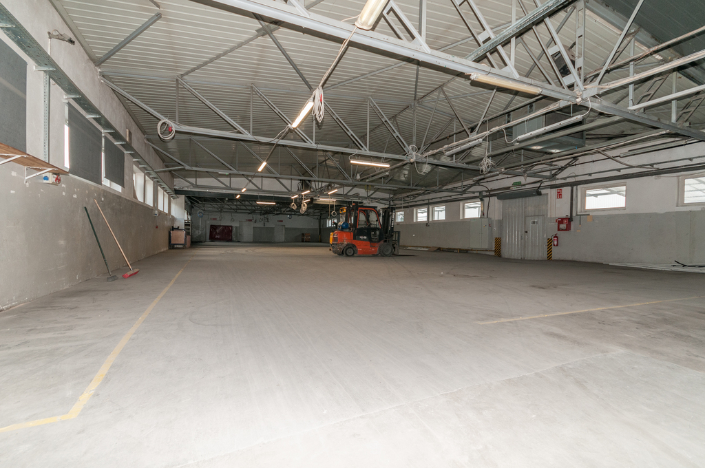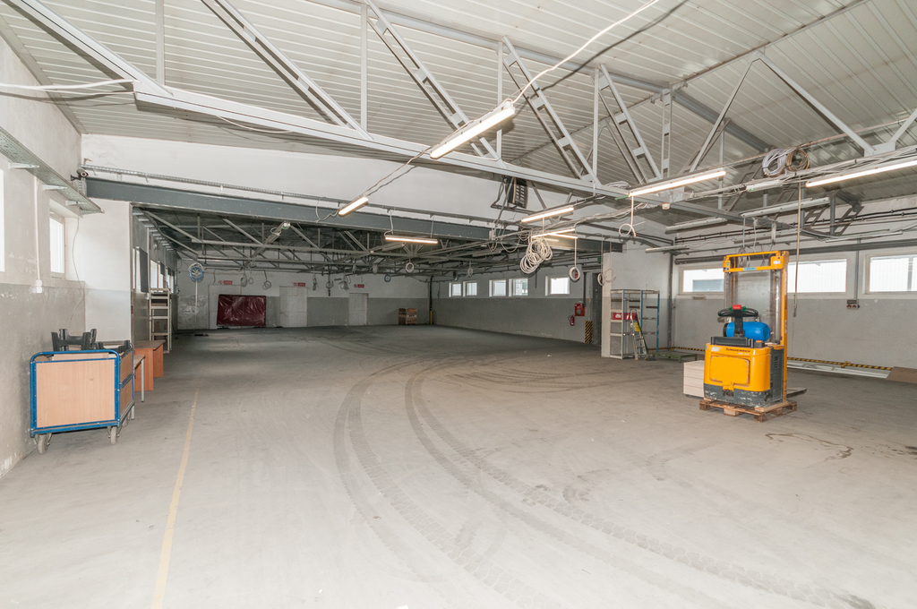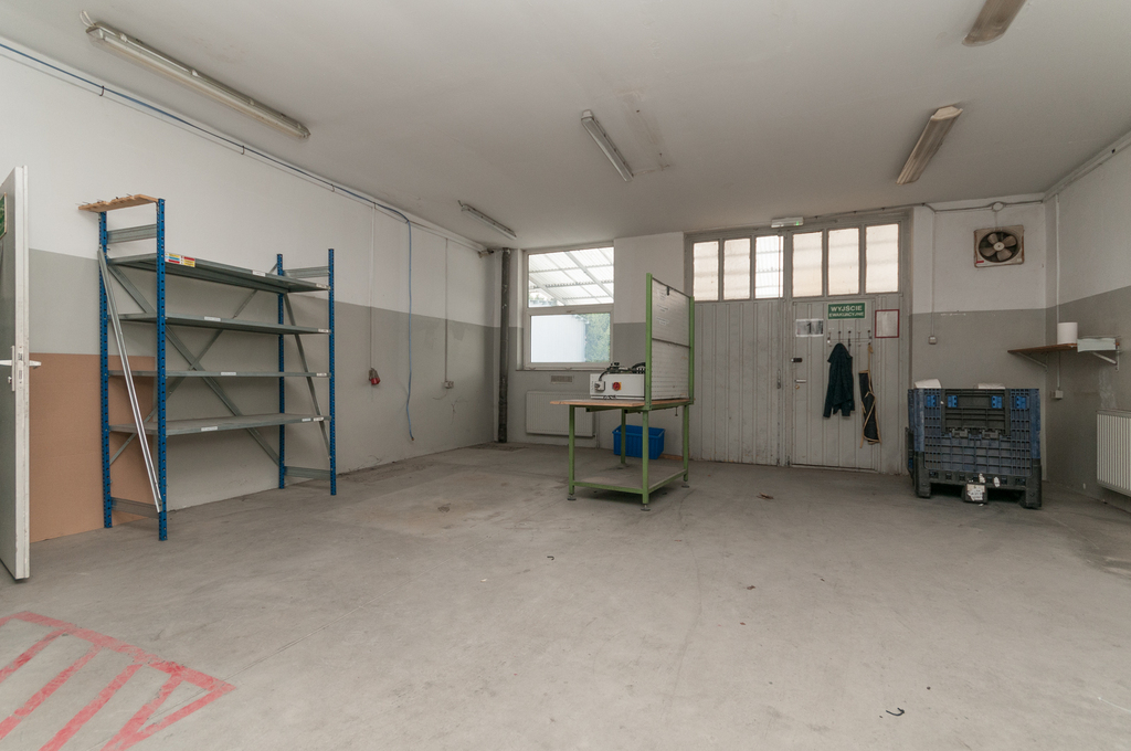 Pierwsza część hali ma wymiary ok. 26m X 15m i wysokości ok. 3,15m w najniższym punkcie. W tej części znajdują się dwie bramy wjazdowe dla sztaplarek/wózków widłowych o szerokości ok. 250cm i wysokości 300cm, kotłownia oraz dodatkowe pomieszczenia.