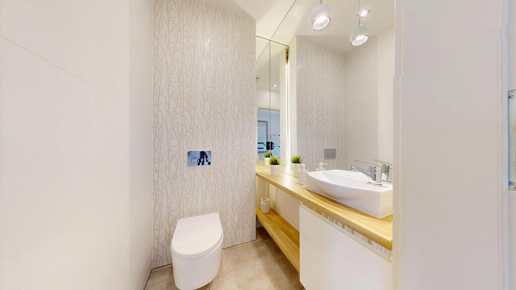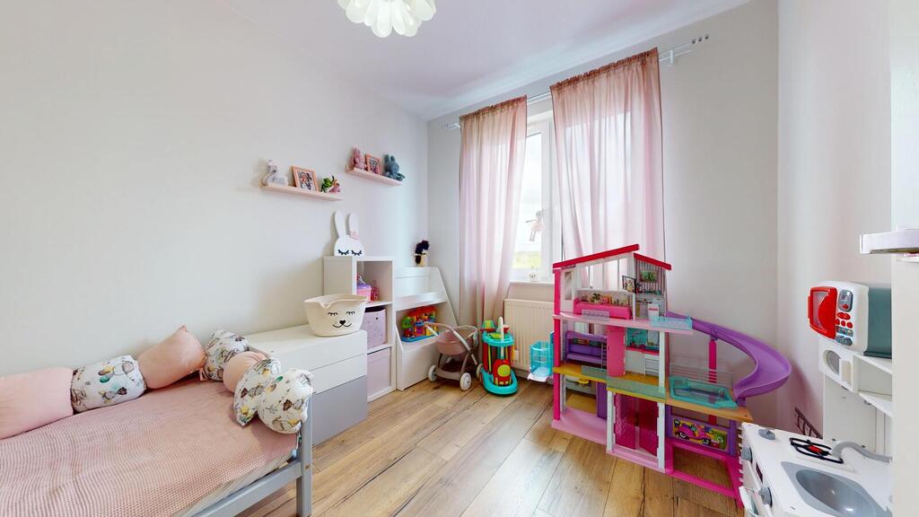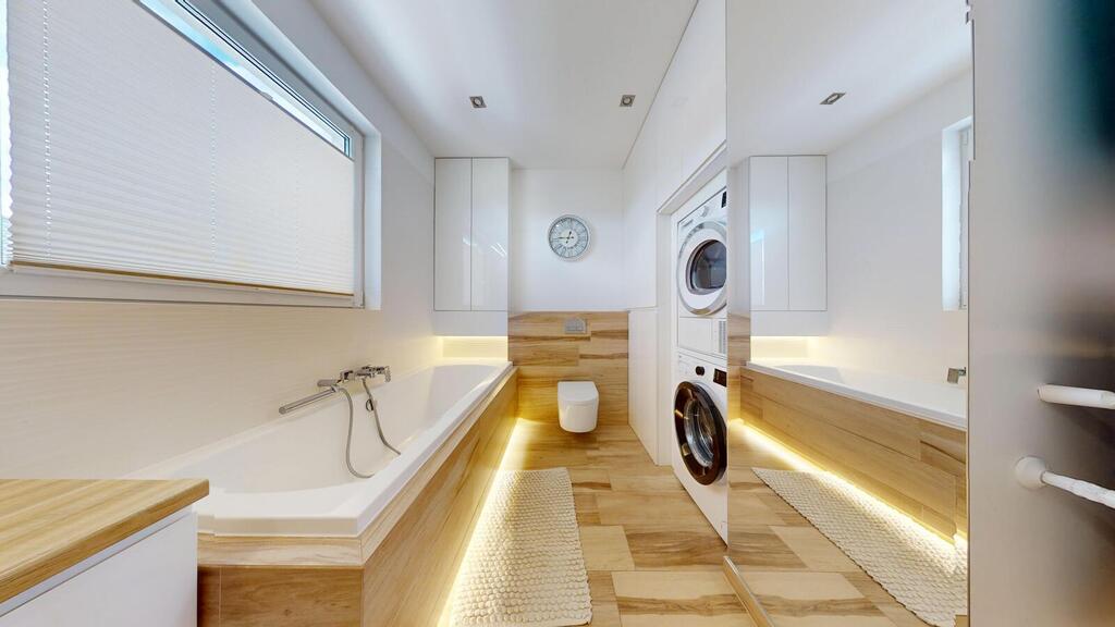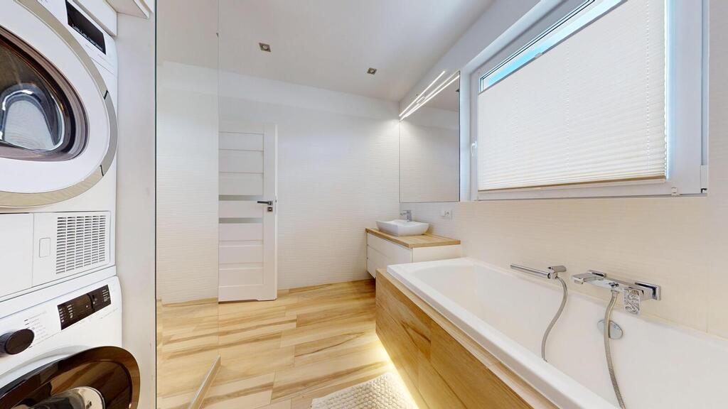 - słusznej wielkości (ok. 8 m2) łazienka razem z WC wyposażona w wannę. Z zabudową na pralkę i suszarkę oraz z oknem.