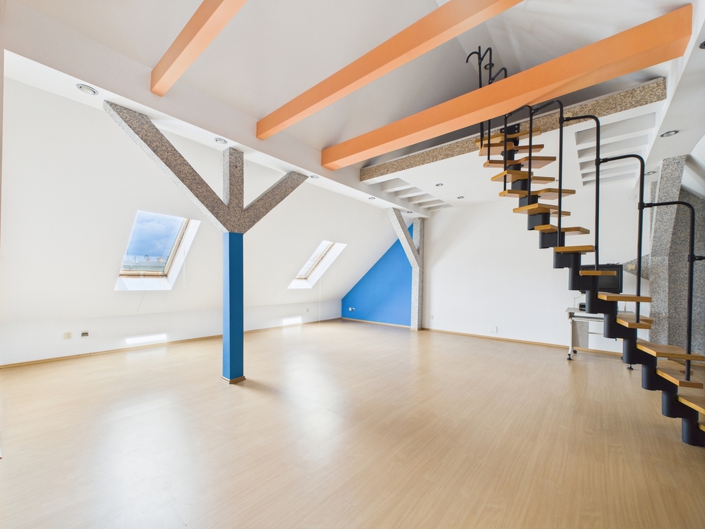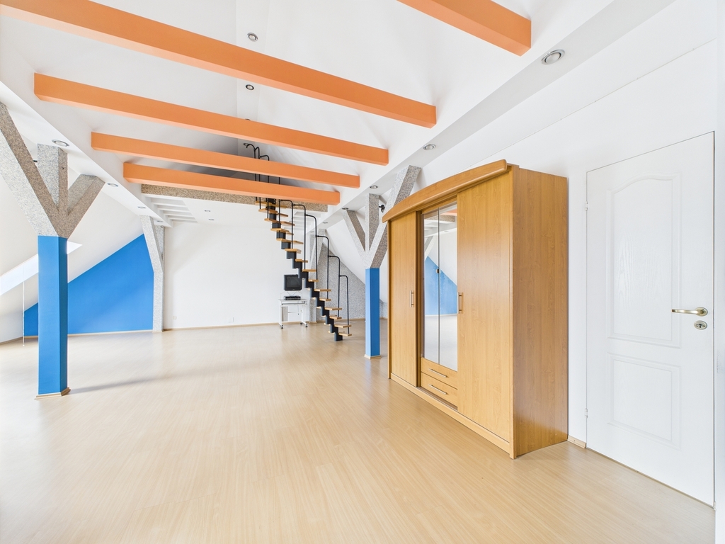 Poddasze w formie otwartej przestrzeni z antresolą oraz toaletą.